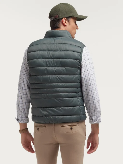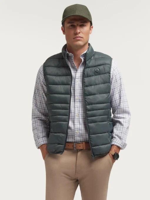 Chaleco acolchado con cuello subido. Dos bolsillo a la altura de la cintura, logo grabado en el frontal y sisa y cintura en punto elástico. Forro interior a contraste con bolsillos.