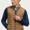 Chaleco acolchado con cuello subido y cierre central mediante cremallera, dos bolsillos a la altura de la cintura y logo de la marca grabado en el pecho. Elástico en la sisa y cintura. Forro interior a contraste con bolsillos.
