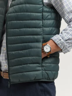 Chaleco acolchado con cuello subido y cierre central mediante cremallera, dos bolsillos a la altura de la cintura y logo de la marca grabado en el pecho. Elástico en la sisa y cintura. Forro interior a contraste con bolsillos.