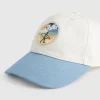 Gorra con detalle personalizado bordado en el frontal, visera curva y ajustable en la parte trasera mediante pasador metálico.