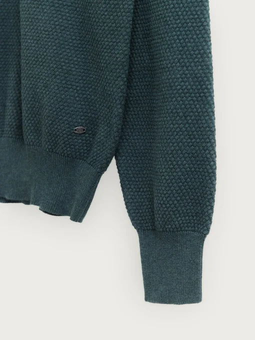 Jersey confeccionado en algodón con estructura en su tejido. Cuenta con cuello alto con medio cierre de cremallera y cuello, puños y bajo en acabado elástico. Corte regular fit.