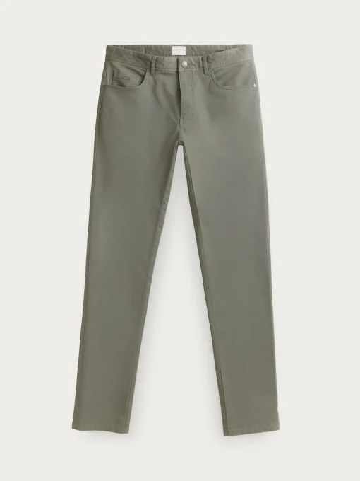 Pantalón de corte slim fit con 5 bolsillos. Cierre central mediante botón y cremallera, bolsillo cerillero y dos bolsillos traseros con pespunte al tono. Etiqueta personalizada en la cinturilla en aspecto piel.