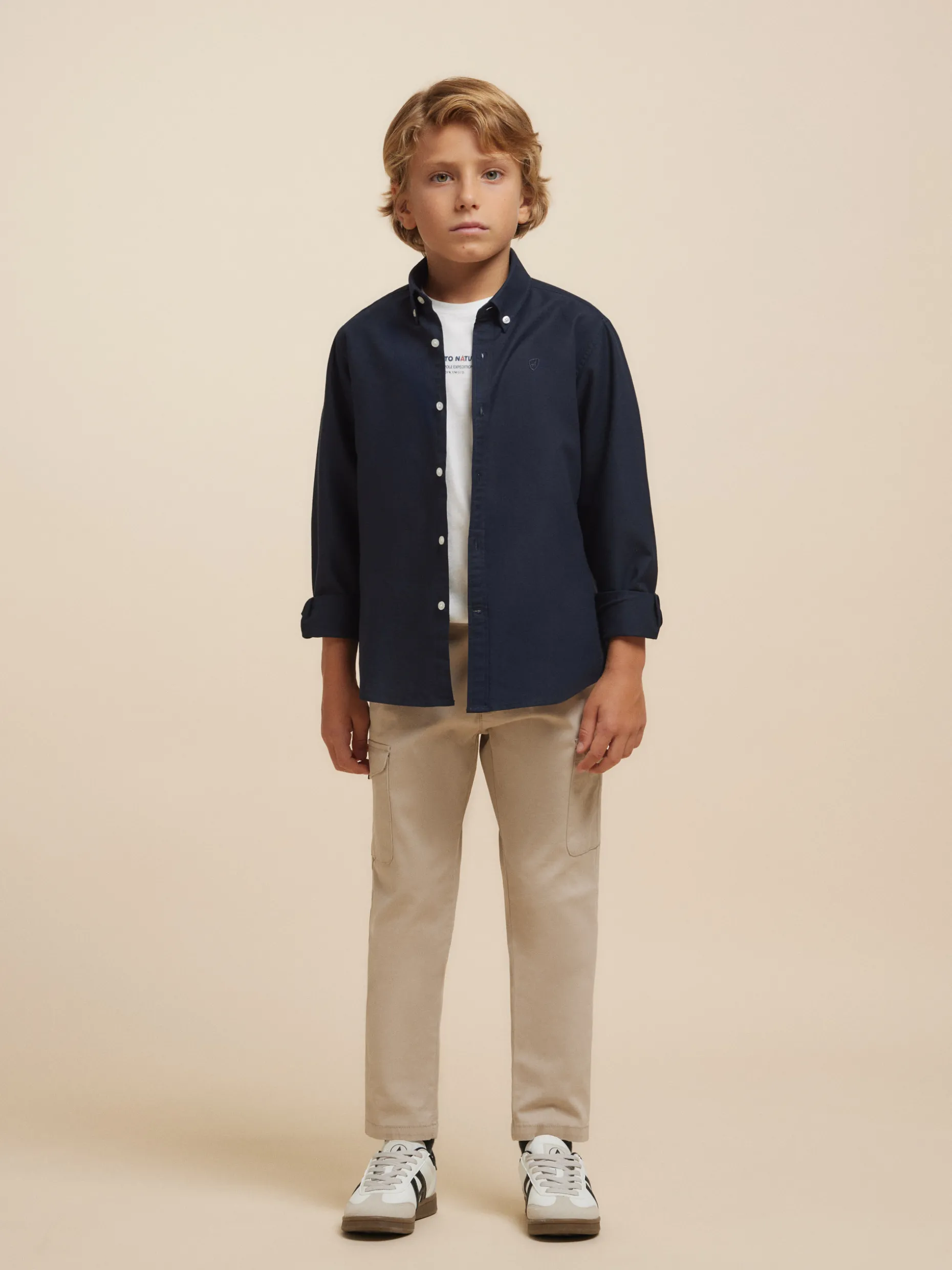 Camisa de corte regular fit con cuello clásico de botón, manga larga con puños simples y logo de la marca grabado en el frontal al tono.
