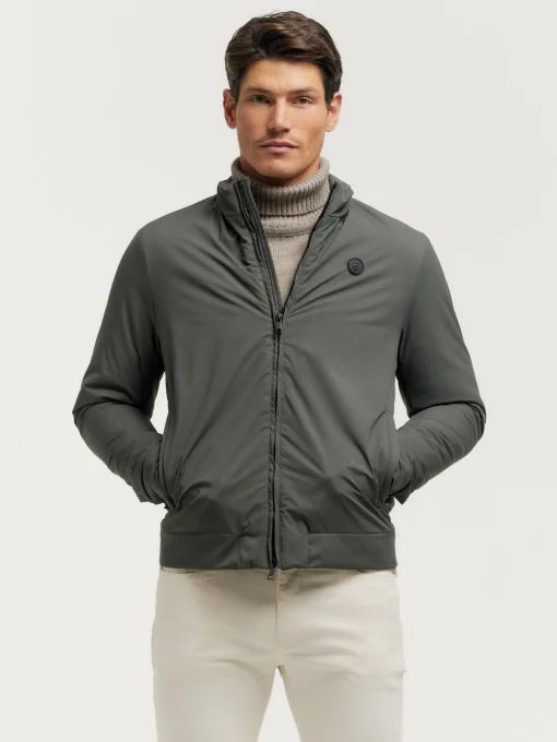 Cazadora con cuello subido, cierre central mediante cremallera y manga larga con puños ajustables. Dos bolsillos a la altura de la cintura con cierre de cremallera. Logo engomado en el frontal. Corte regular fit.