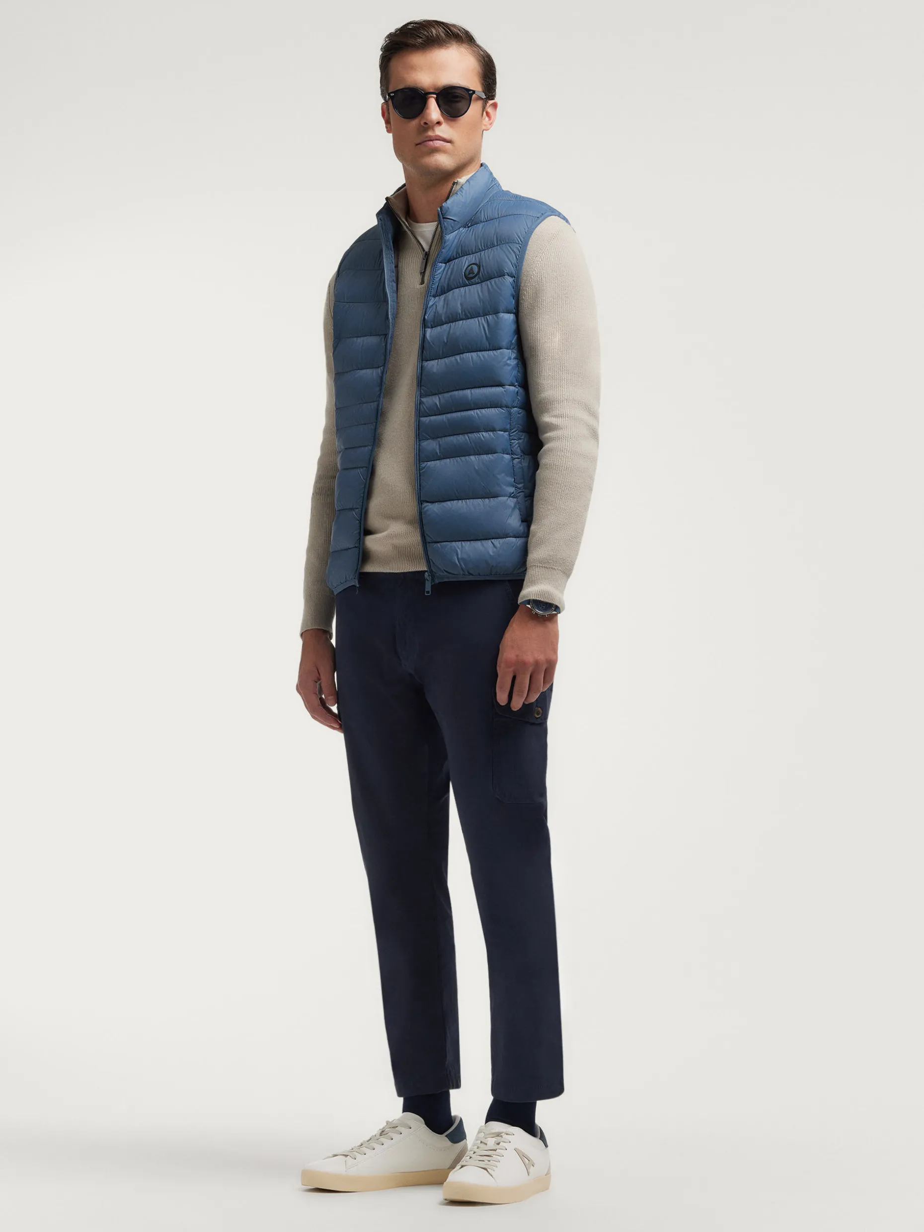 Chaleco acolchado con cuello subido. Dos bolsillo a la altura de la cintura, logo grabado en el frontal y sisa y cintura en punto elástico. Forro interior a contraste con bolsillos.