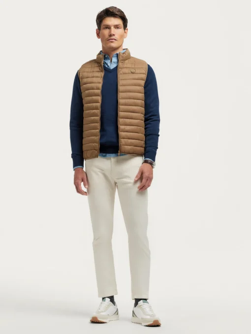 Chaleco acolchado con cuello subido y cierre central mediante cremallera, dos bolsillos a la altura de la cintura y logo de la marca grabado en el pecho. Elástico en la sisa y cintura. Forro interior a contraste con bolsillos.