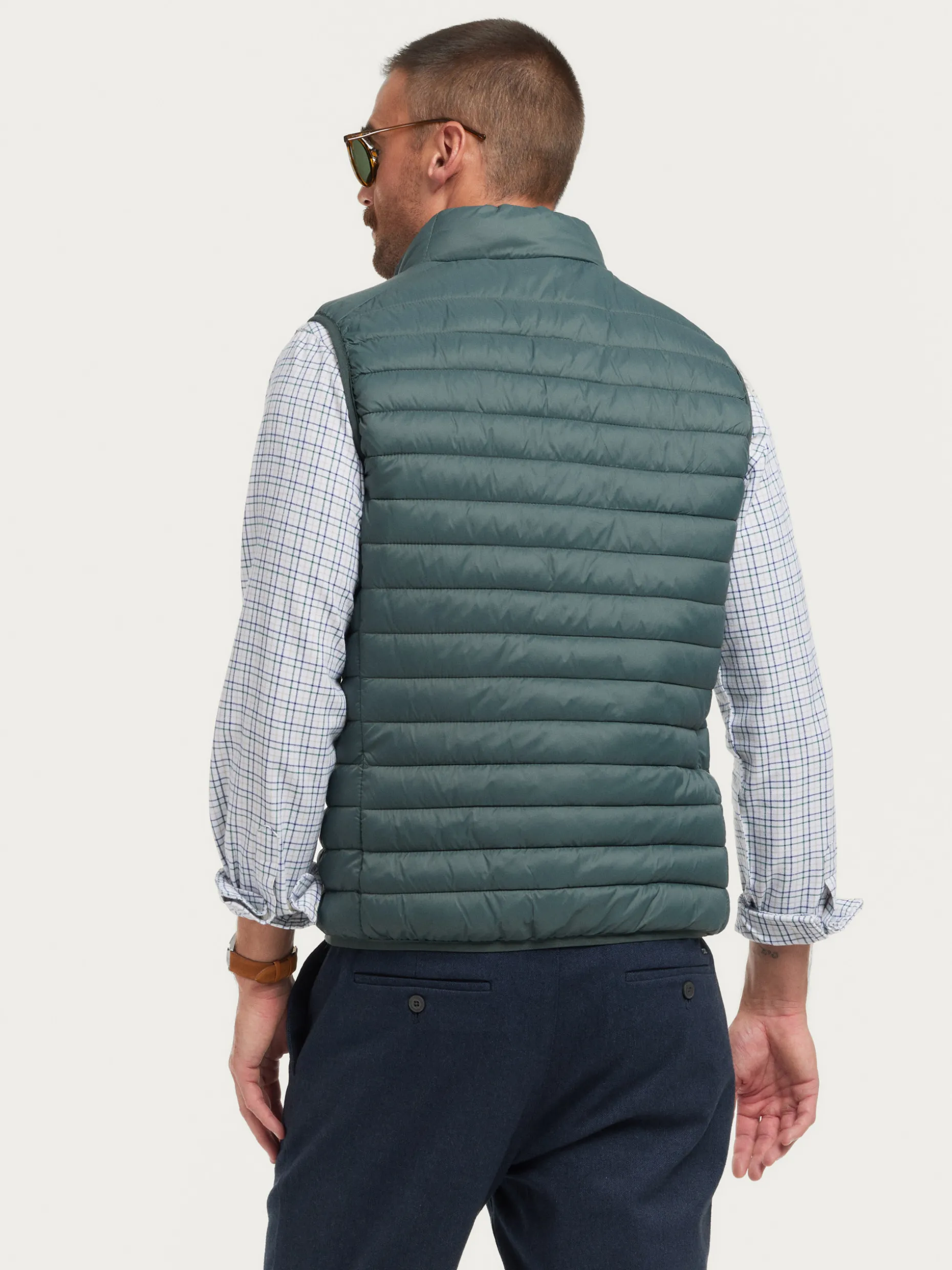 Chaleco acolchado con cuello subido y cierre central mediante cremallera, dos bolsillos a la altura de la cintura y logo de la marca grabado en el pecho. Elástico en la sisa y cintura. Forro interior a contraste con bolsillos.