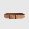 Cinturón con cierre central mediante hebilla metálica, pasador al tono y logo de la marca grabado al tono.