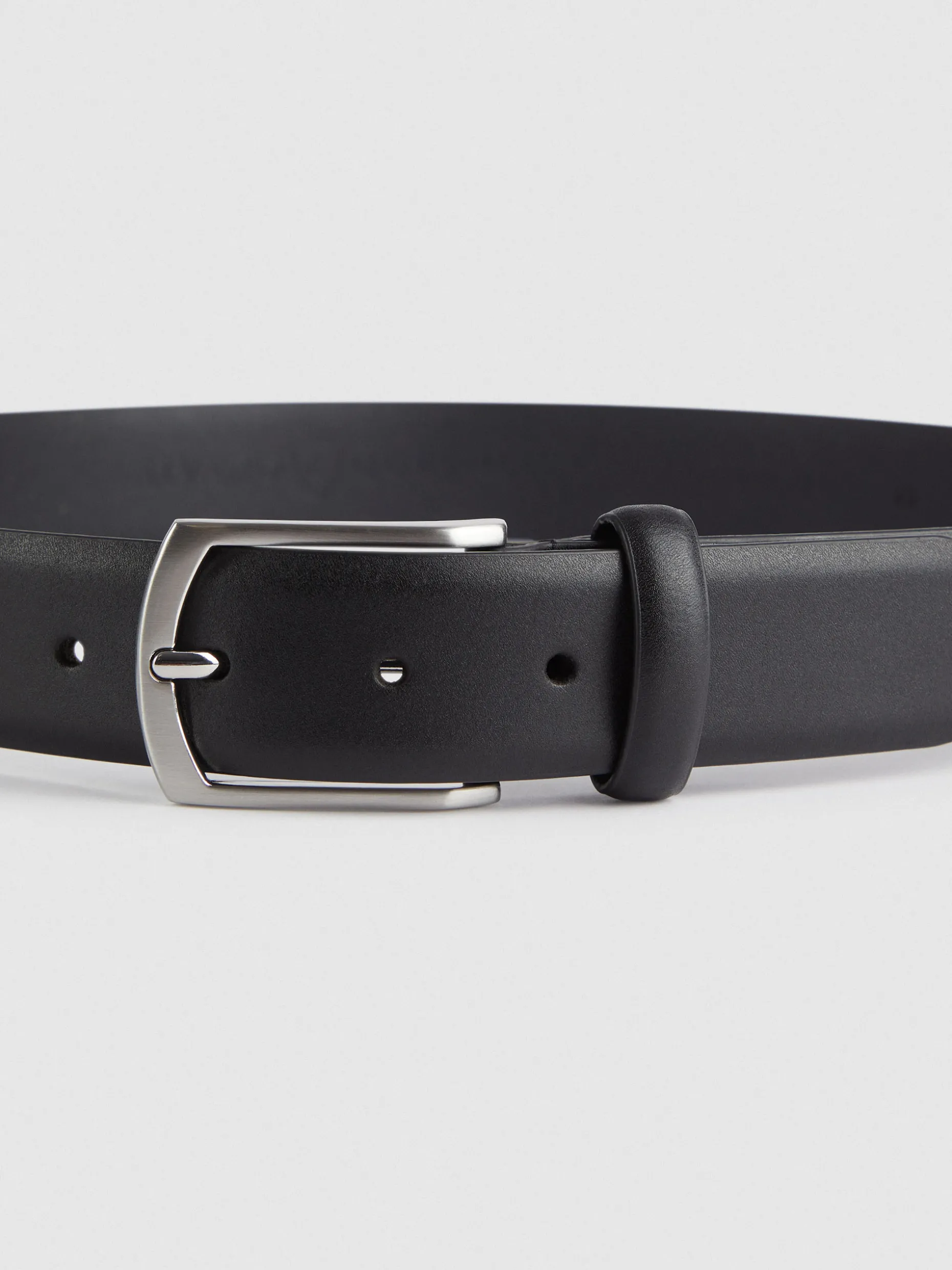 Cinturón de vestir confeccionado en piel con cierre central mediante hebilla metálica y pasador al tono.