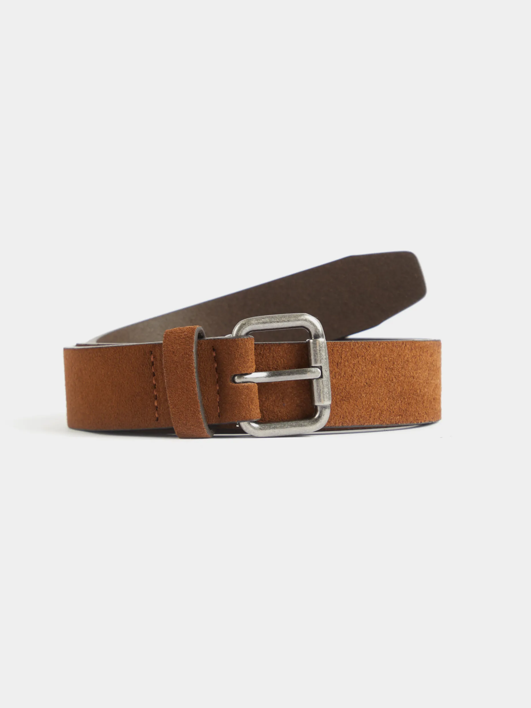 Cinturón listo estilo casual confeccionado en serraje con cierre mediante hebilla metálica a contraste y pasador al tono. Detalles y pespuntes al tono.