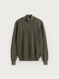 Jersey confeccionado en algodón con estructura en su tejido. Cuenta con cuello alto con medio cierre de cremallera y cuello, puños y bajo en acabado elástico. Corte regular fit.