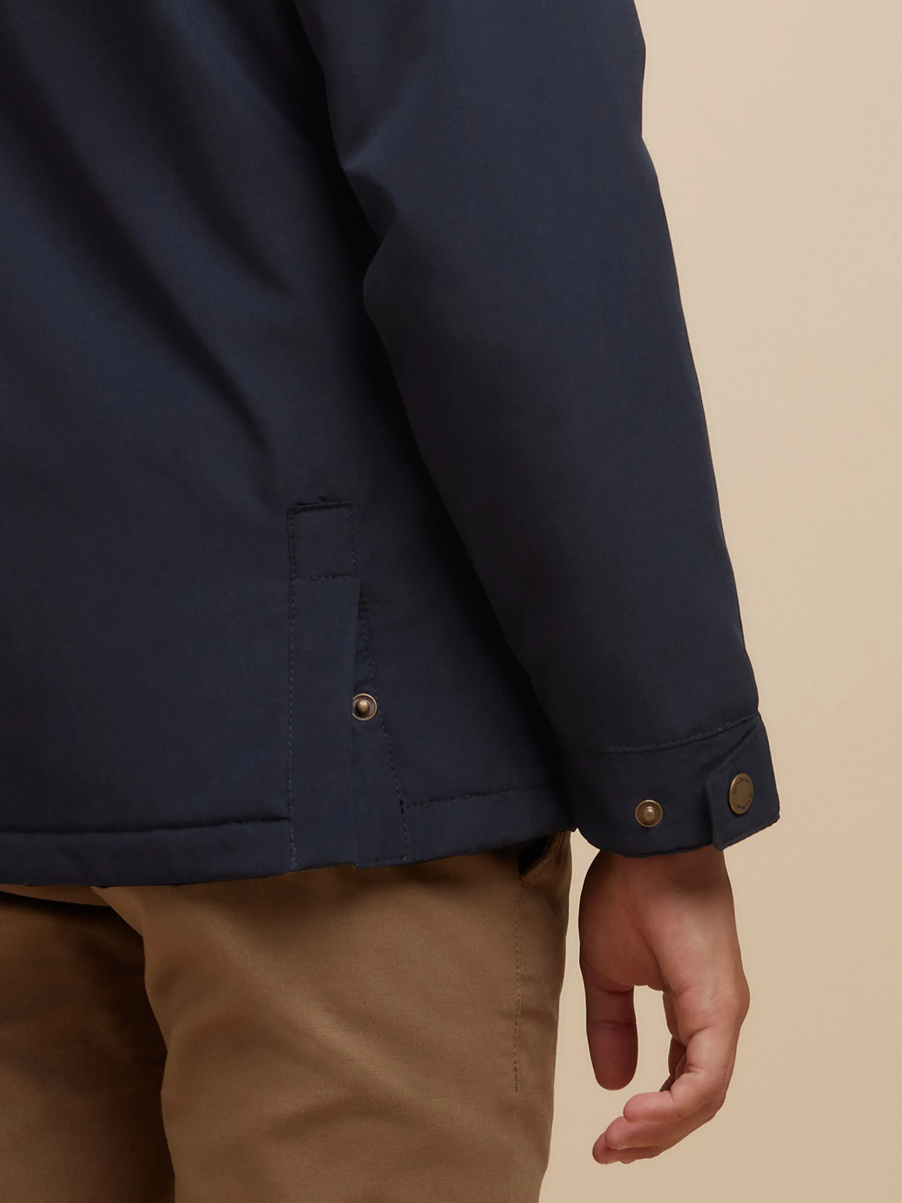 Parka con cuello a contraste y cortavientos interior desmontable. Cierre central mediante cremallera oculta por tapeta de botones a presión, cuatro bolsillos en el frontal y detalle personalizado en una de las mangas. Manga larga con puños ajustables. Forrada y con bolsillos en el interior.